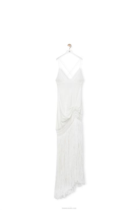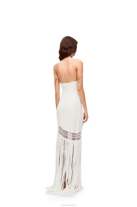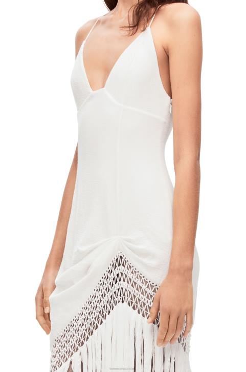 Long dress in textured cotton blend with spaghetti straps and a fringed macrame hem.