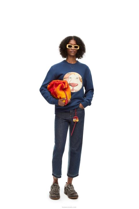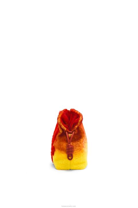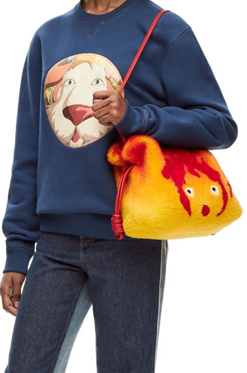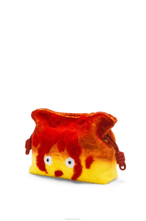 Launched in the 1970s, the Flamenco Clutch cinches closed using drawstring pulls finished in signature coiled knots. Thisversion is crafted in a handmade degrade shearling and features Calcifer crafted using an intarsia technique and different depths of shearling.It is part of the LOEWE x Howl's Moving Castle capsule collection.