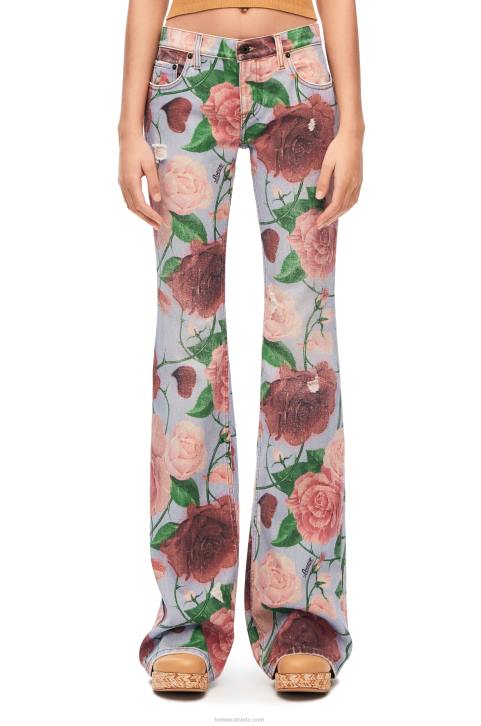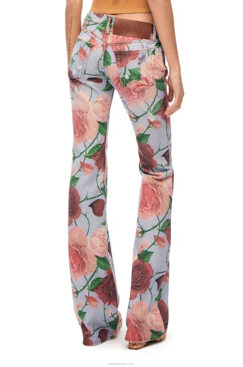 Flared five pocket jeans in washed denim with an all-over rose print and ripped detailing.