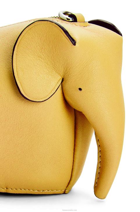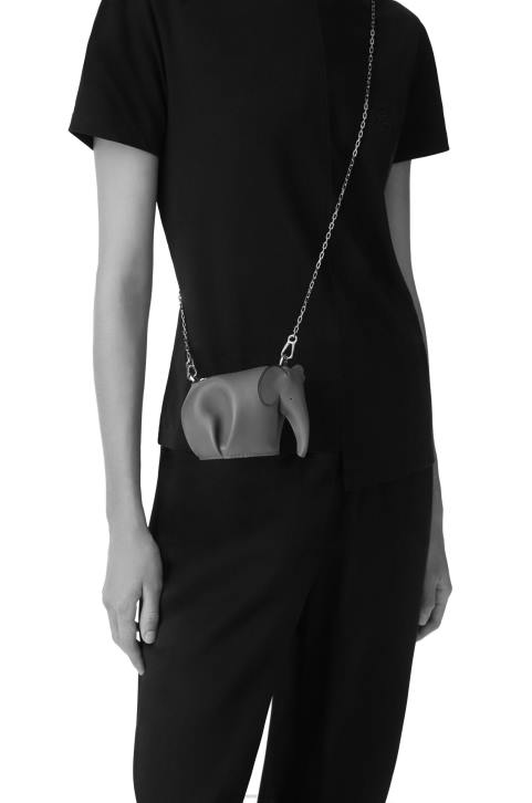 A calfskin pouch cut in the shape of an elephant with a zip top and a detachable chain strap.