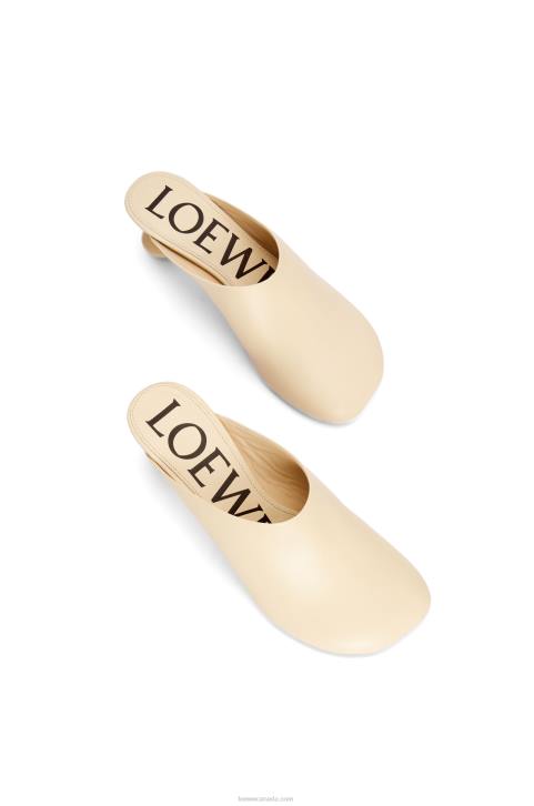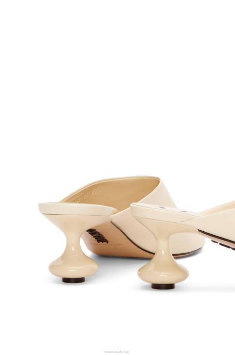 Mules in goatskin with a petal shaped toe and lacquered signature toy heel. The SS23 shoe collection plays on tension andcontrast: handcraft clashes with a fetish attitude and natural materials collide with the technical. Key details include playful heels, graphic logos and asymmetric toes and straps.