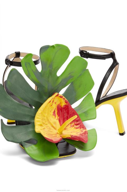 Asymmetric heel sandal in shiny lambskin with a monstera leaf and anthurium flower made in light foam rubber. Featuring alacquered heel, buckled ankle strap and single buckled strap across the toe. The SS23 shoe collection plays on tension and contrast: handcraft clashes with a fetish attitude and natural materials collide with the technical. Key details include playful heels, graphic logos and asymmetric toes and straps