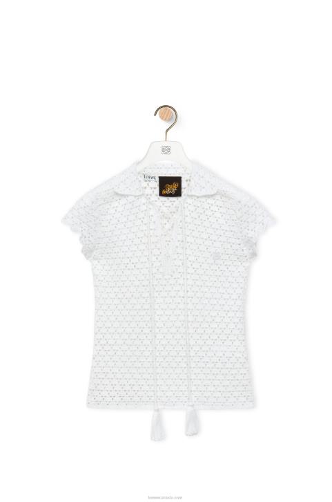 Short sleeve polo top handcrafted in crochet with scalloped sleeves and a lace up collar with tassel ties.