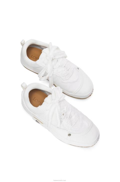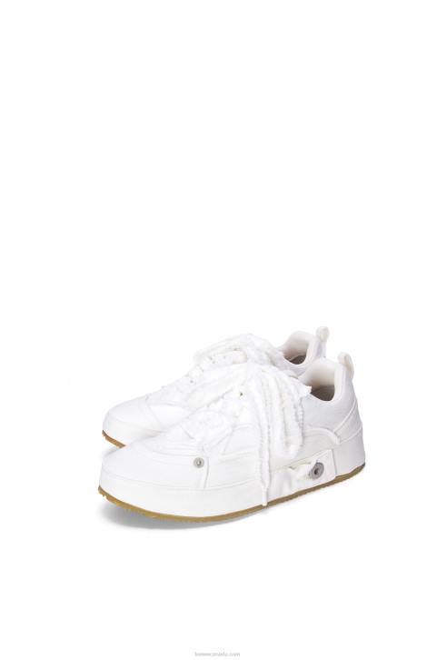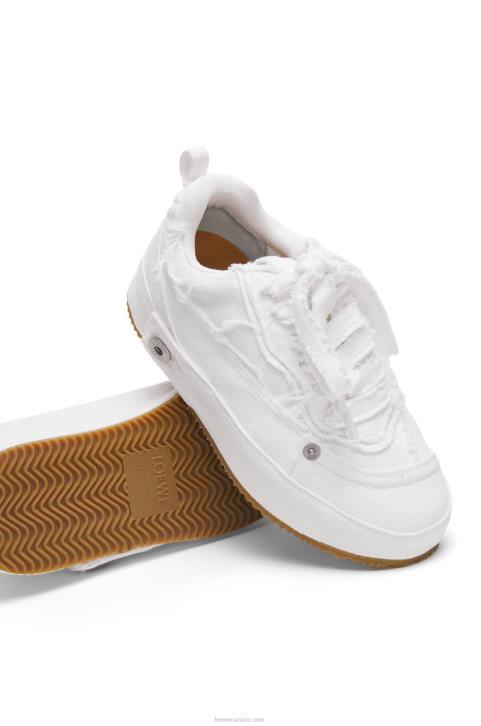 Lace up sneaker with a soft upper constructed in a patchwork of denim with frayed edges and a LOEWE engraved button.