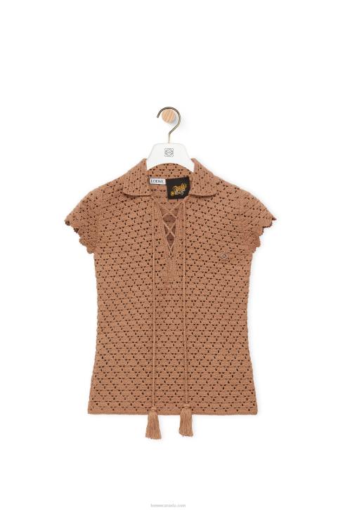 Short sleeve polo top handcrafted in crochet with scalloped sleeves and a lace up collar with tassel ties.